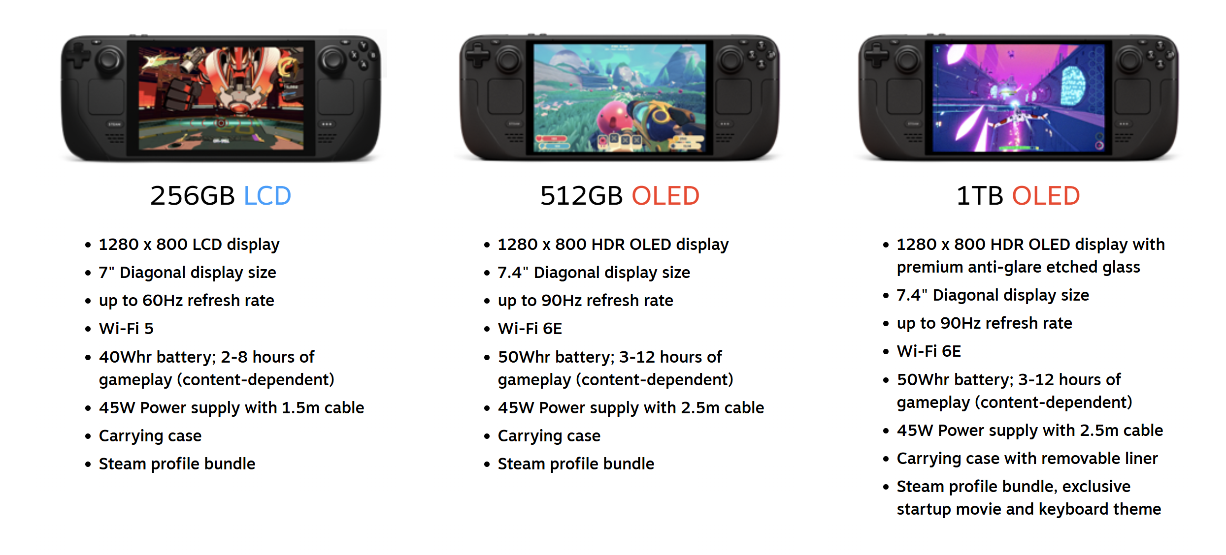 - OLED 모델 : 512GB, 1TB SSD, 7.4인치 1280x800, 640g, 50Whr 배터리로 업그레이드되었다.