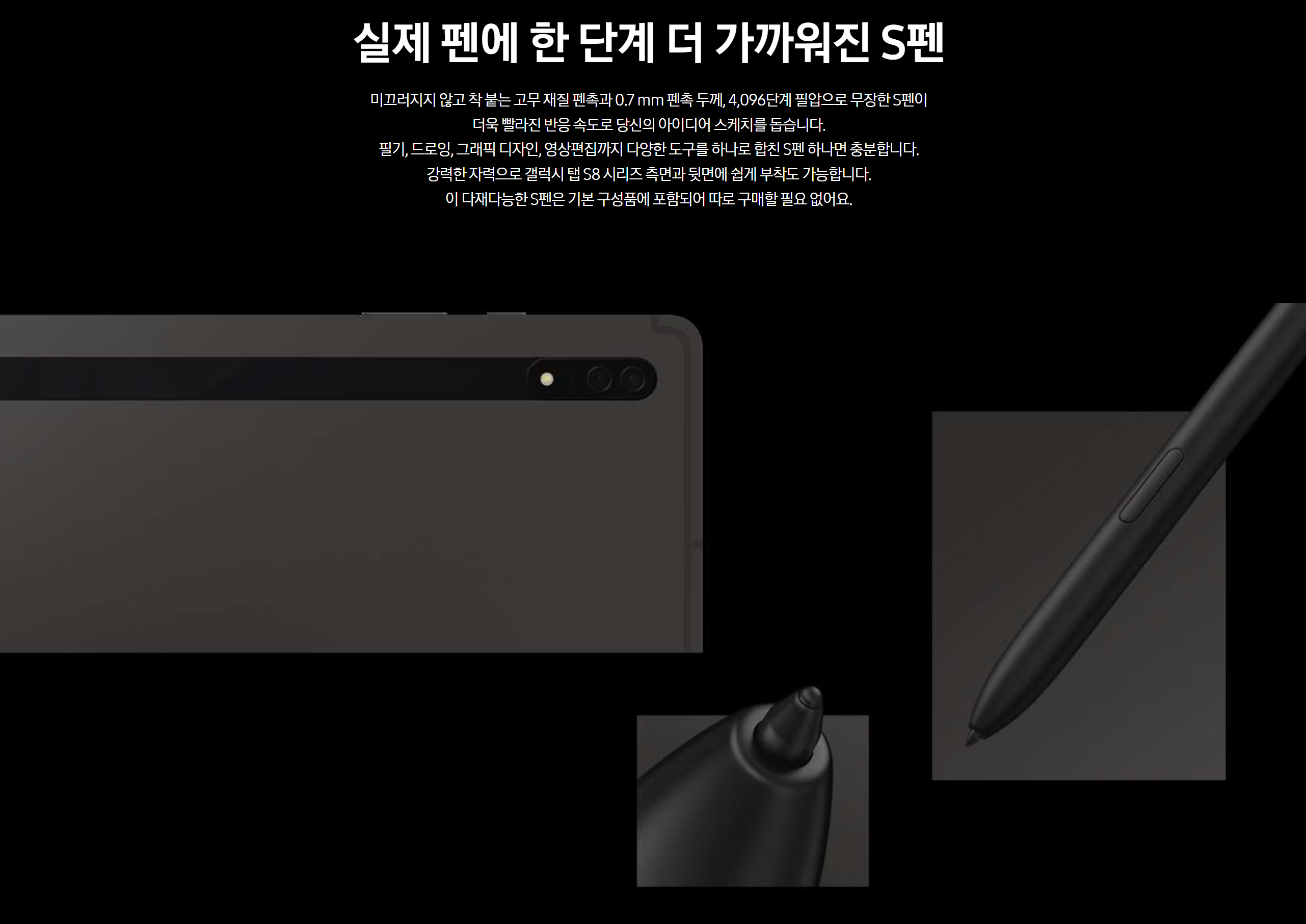 갤럭시 탭 S8 울트라에는 삼성 S펜이 기본으로 포함되어 있습니다. 필기감이 자연스러우며, 필기 내용을 텍스트로 변환하는 등 AI 기반의 인텔리전스 기능이 크게 향상되어 효율적인 작업을 돕습니다. 또한, 필기 후 수평을 맞춰주는 등 필기 경험을 개선하는 다양한 기능을 제공합니다.
