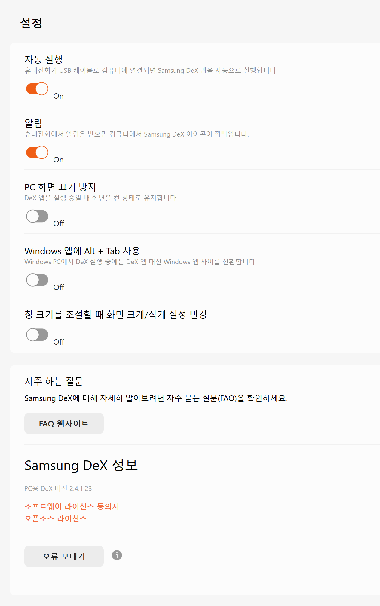 - 북커버나 외부 화면 연결 시 자동으로 덱스모드가 실행 되도록 설정 가능